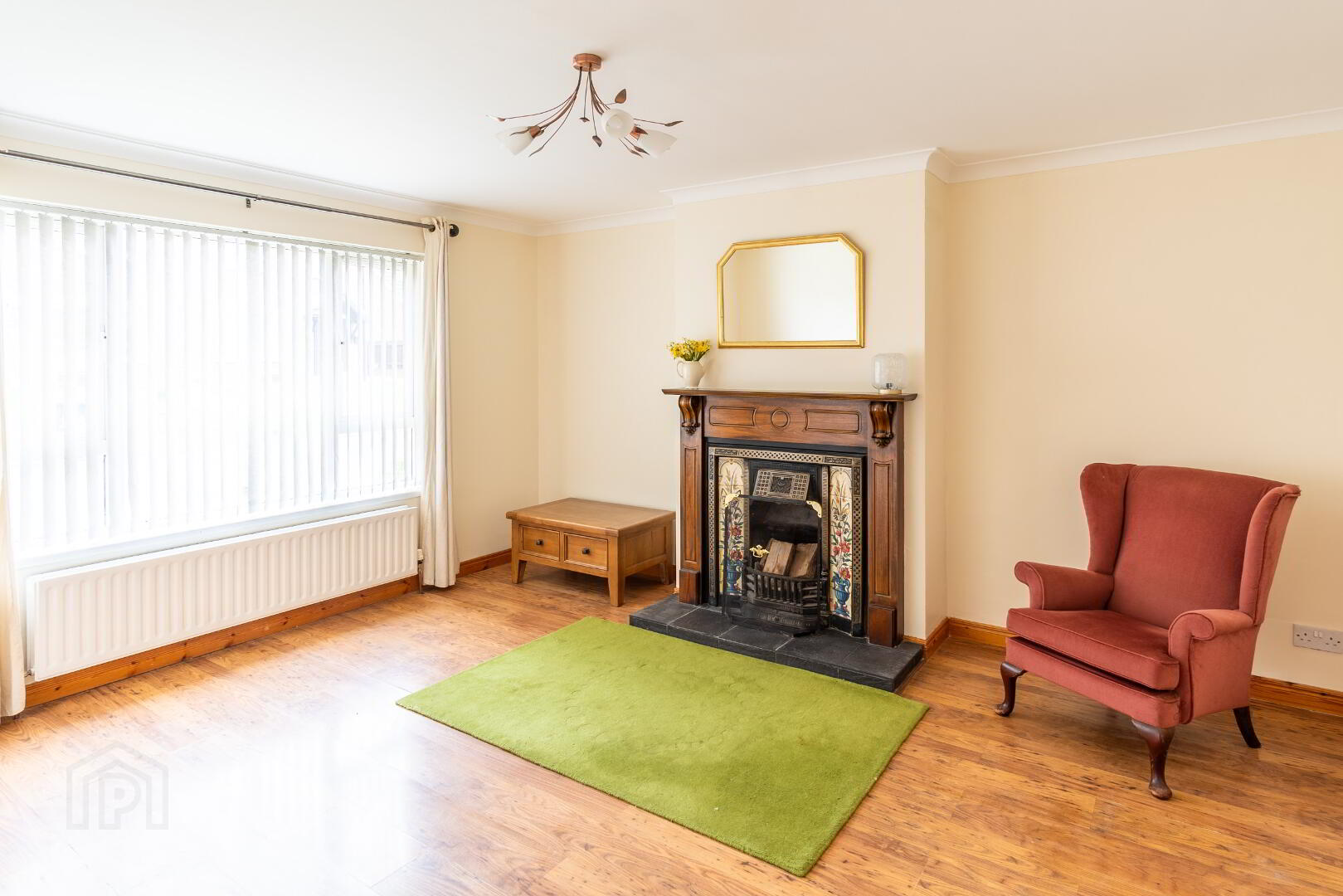 Laminate flooring, open cast iron fireplace with decorative tile inserts and timber surround.