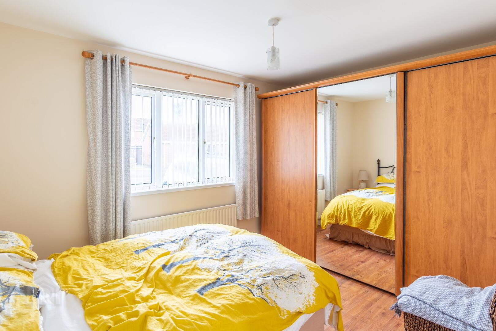Laminate flooring, fitted wardrobes with sliding mirrored doors.