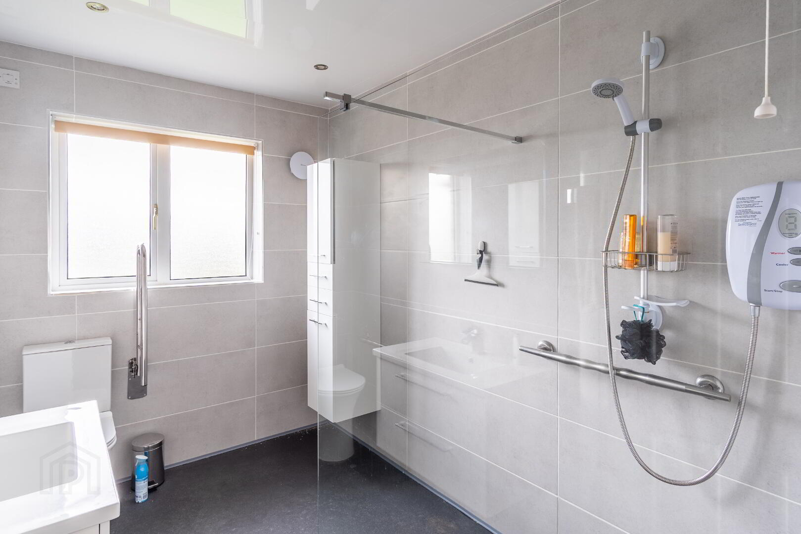 Tiled walls, non-slip flooring, white suite comprising low flush WC, vanity wash hand basin, electric shower with walk-in enclosure, fitted cabinet.