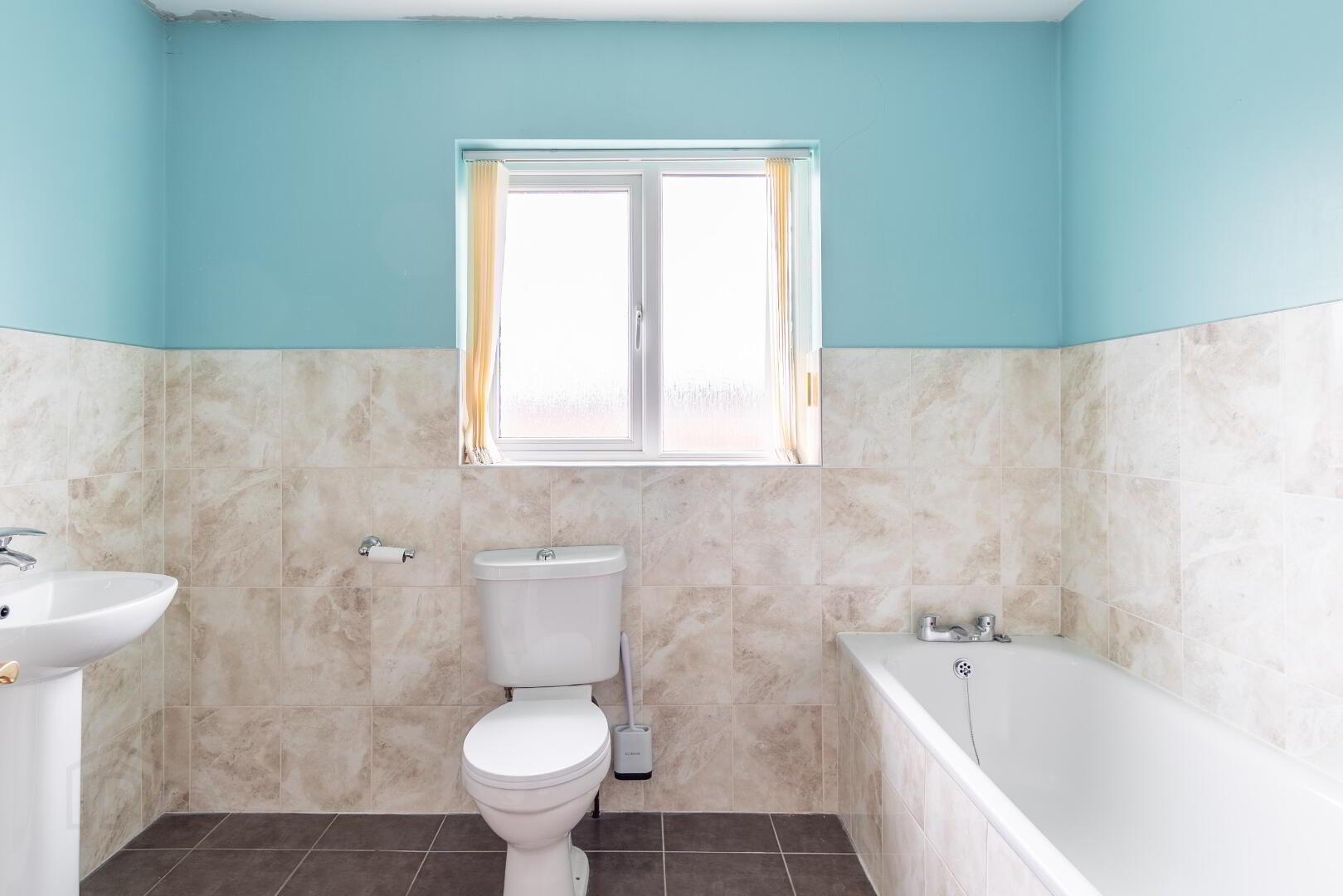 White suite comprising low flush WC, pedestal wash hand basin, tiled bath, electric shower with quadrant enclosure, partially tiled walls, tiled flooring.