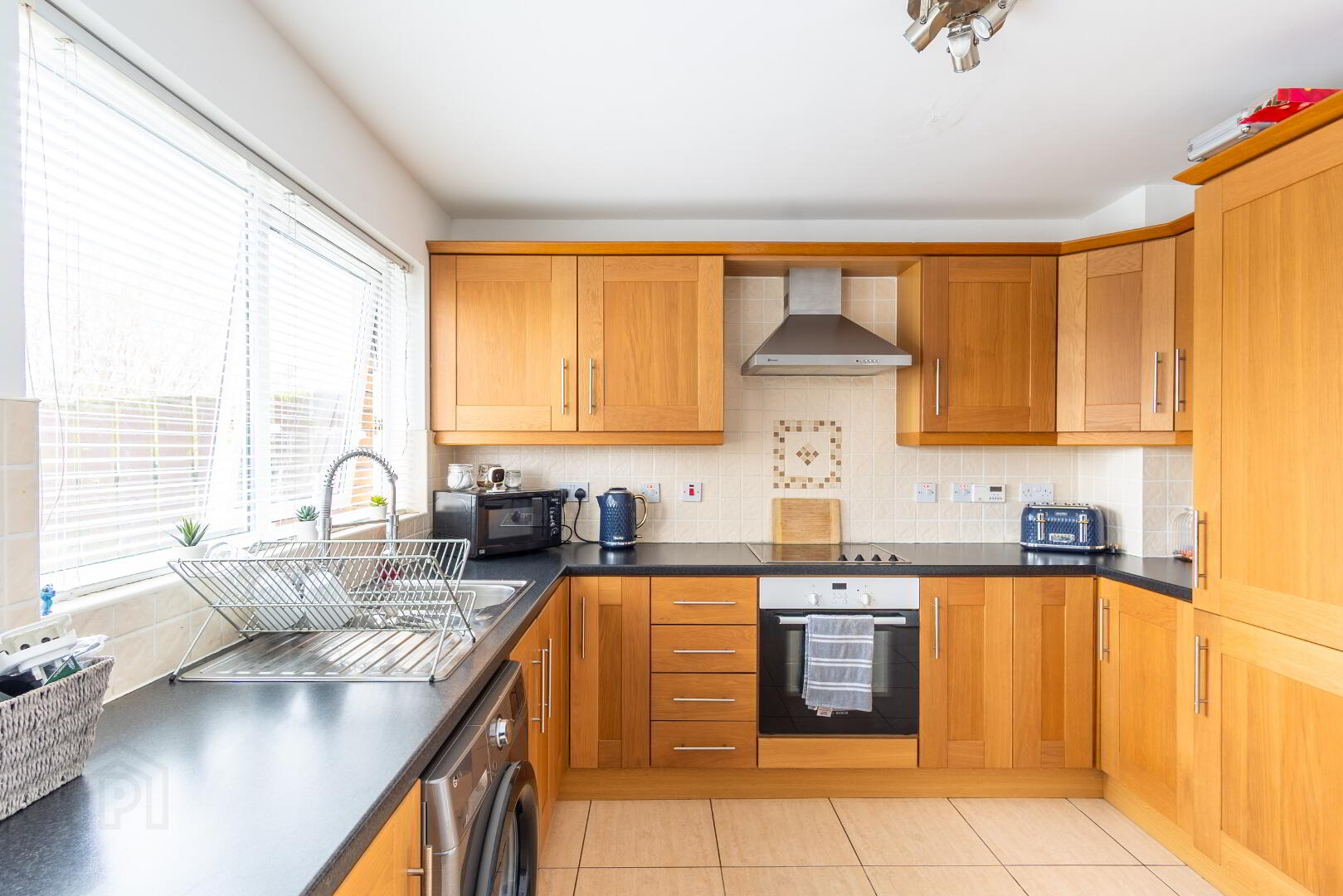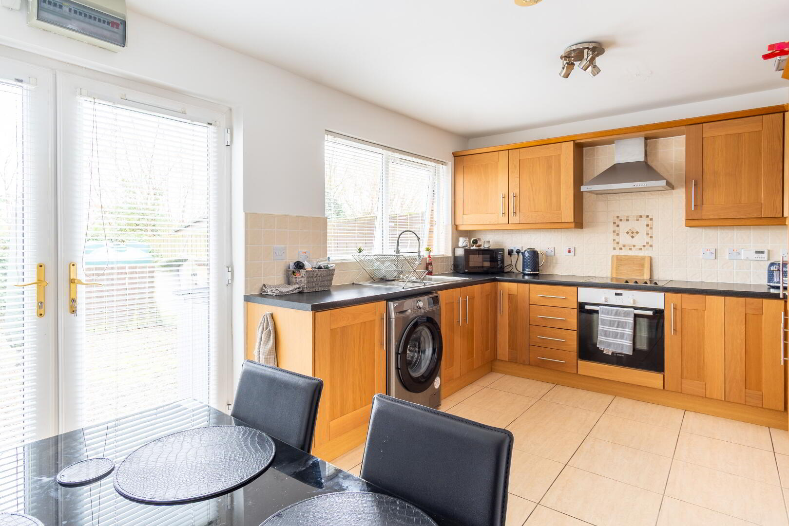 Solid oak kitchen, integrated oven and glass hob, integrated fridge/freezer, stainless steel extractor hood, tiled splash backs, french doors to garden.