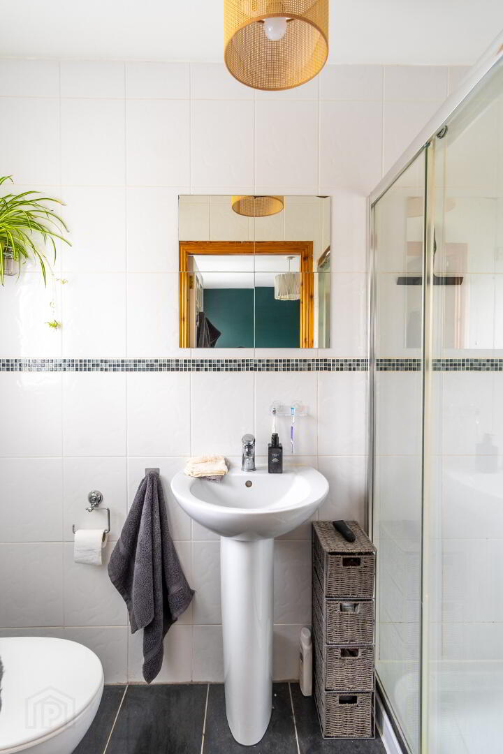 White suite comprising low flush WC, pedestal wash hand basin, electric shower with double enclosure, fully tiled walls and flooring.