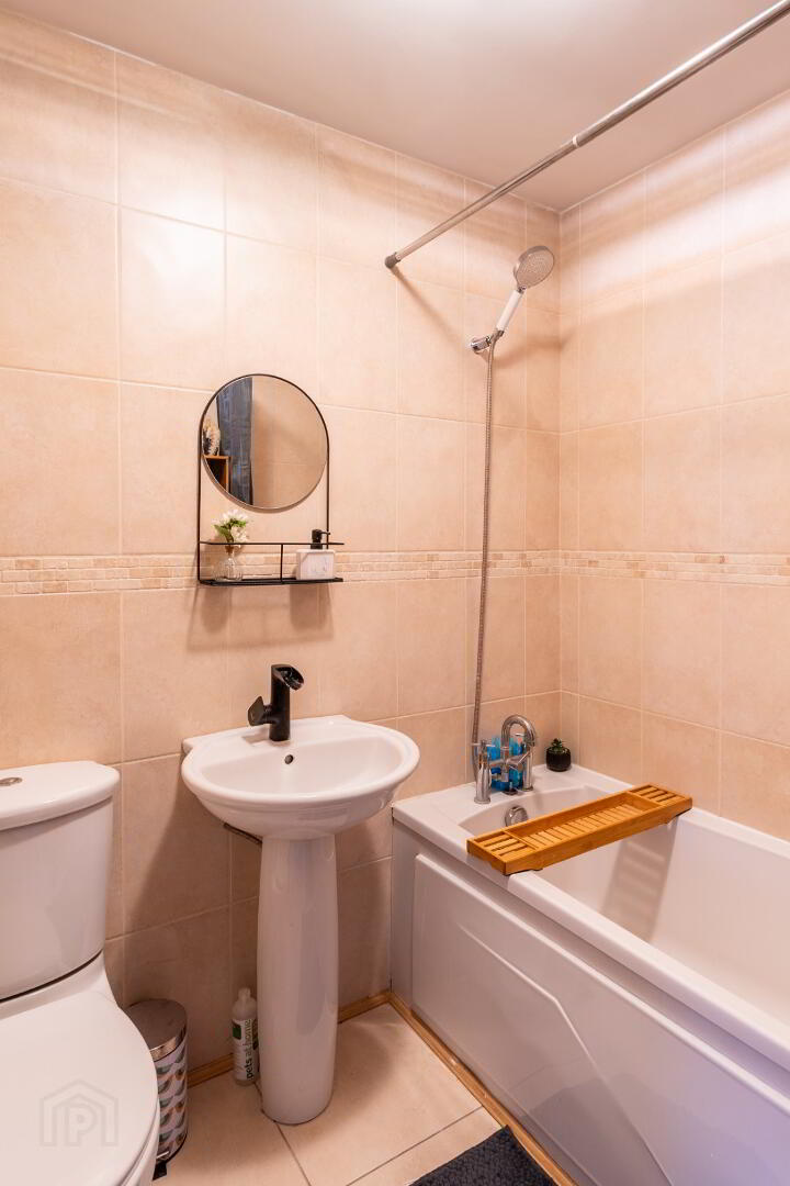 White suite comprising low flush WC, pedestal wash hand basin, panel bath with stainless steel mixer taps and shower extension, fully tiled walls and flooring.