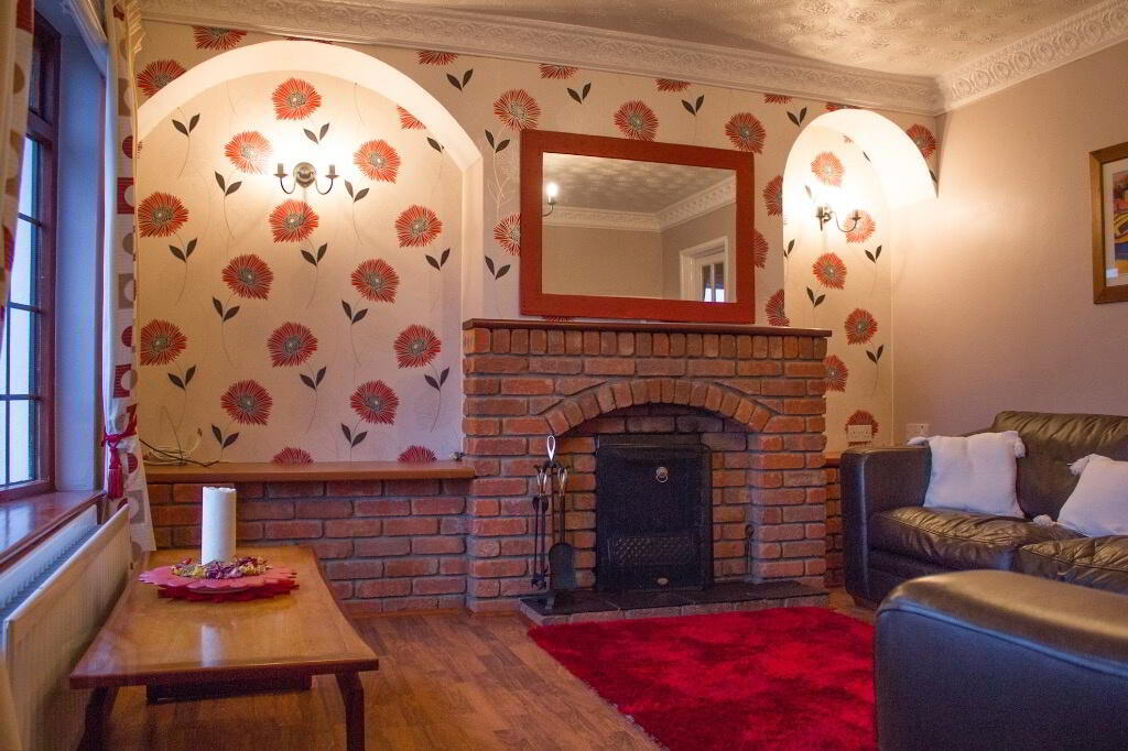 Stunning brick built fireplace with integral side shelves, decorative arched alcoves with wall lighting, laminate flooring, bow window, ceiling cornice, cloaks cupboard.
