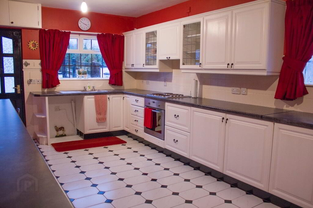 Extended fitted kitchen in white with leaded glass display cabinets, integrated oven and hob, extractor fan, breakfast bar, stainless steel sink unit with mixer taps, integral wine rack, plumbed for washing machine, ceramic tiled flooring and splashbacks.